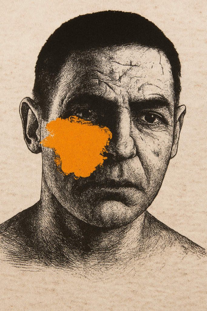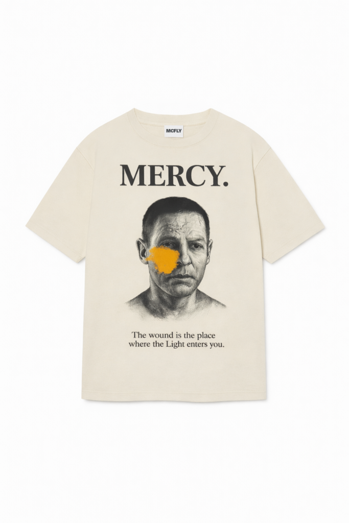The MERCY Graphic T-Shirt is a meditation on damage, survival, and restraint. Designed with a stark black-and-white portrait and a raw orange mark across the face, the artwork reflects the quiet tension between pain and redemption. Subtle, deliberate, and confrontational without being loud.
